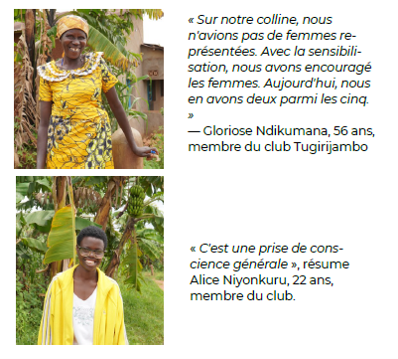 « Sur notre colline, les femmes n’étaient pas représentées. Grâce à la sensibilisation, nous en avons deux femmes élues parmi les 5 élus collinaires.»— Gloriose Ndikumana, 56 ans, membre du club Tugirijambo